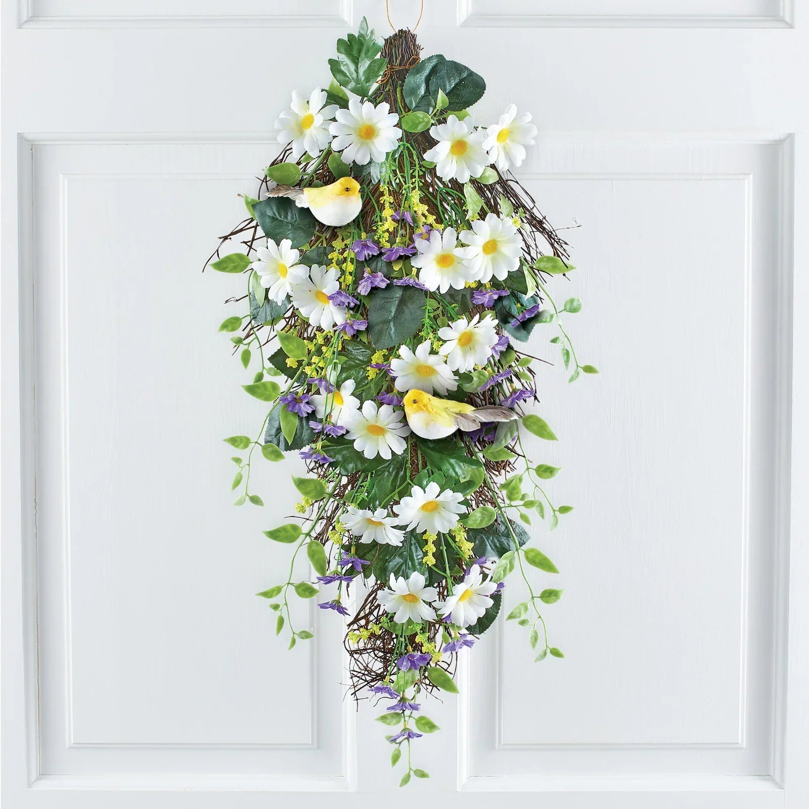 This beautiful swag is the perfect way to add a lovely seasonal color to your home. Featuring cheerful white daisies and greenery the swag is accented with yellow and purple flowers and charming yellow birds. Hook on back for hanging. Plastic, polyester, and wicker. Measures approx. 11"L x 25"H.